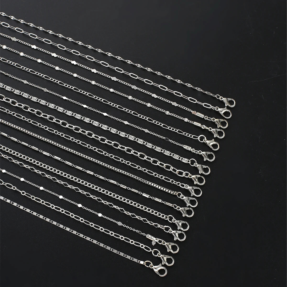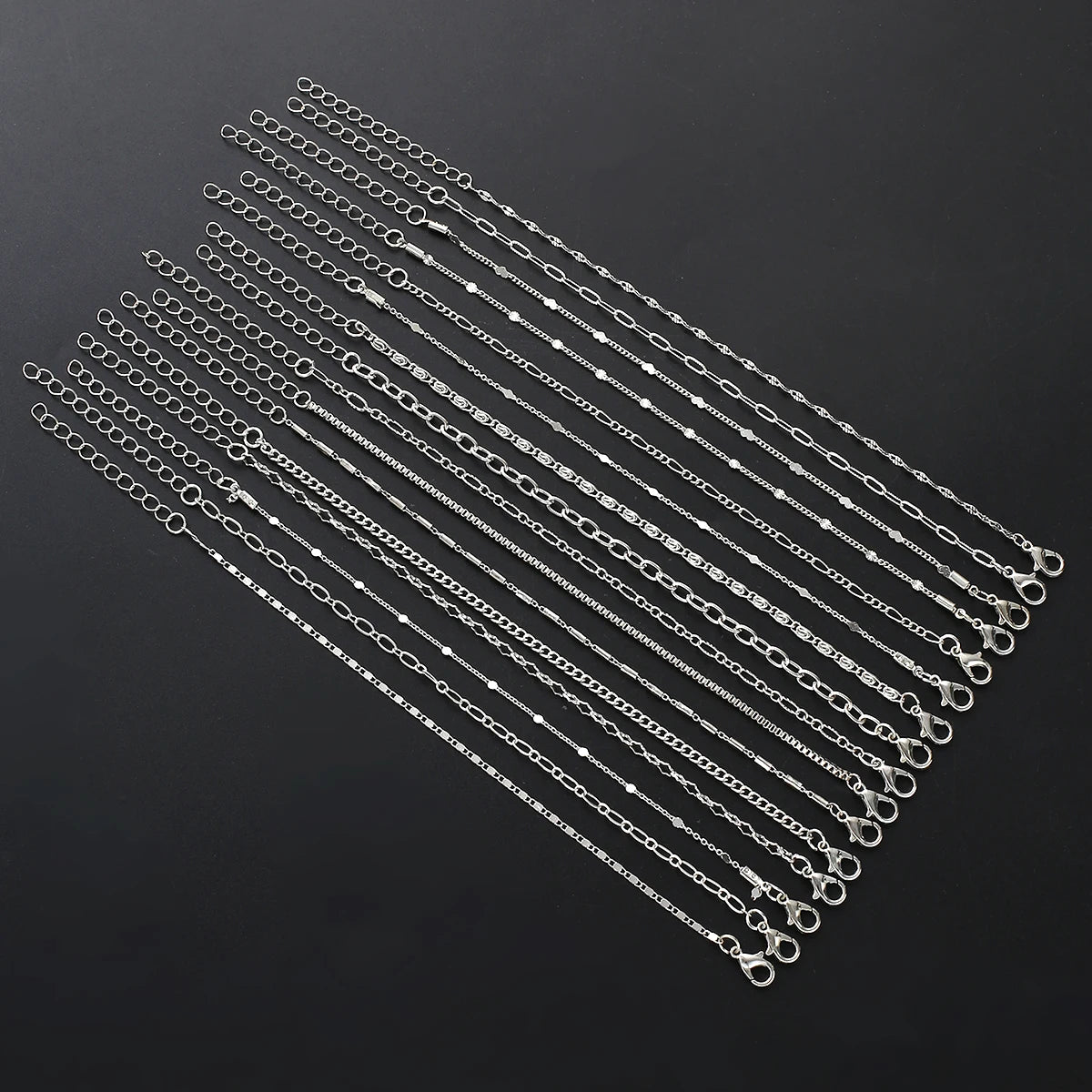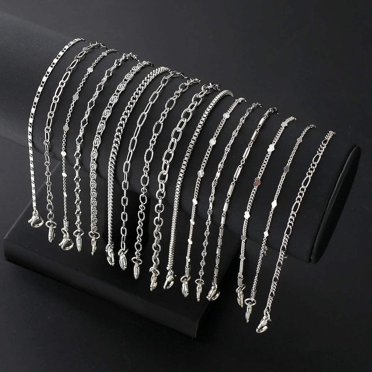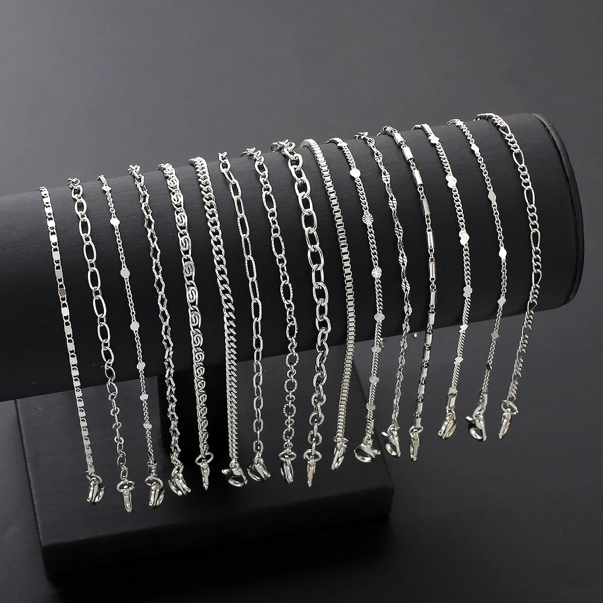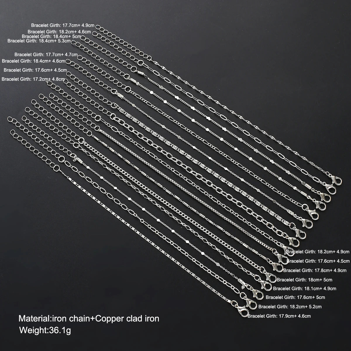 Each bracelet is crafted from alloy with silver-tone plating and polished finish for a sleek, modern shine. The mix includes thin and thicker chains (heart, round spot, twisted paperclip, box, Cuban), many with adjustable clasps to fit varying wrist sizes. Lightweight yet durable, these bracelets are made for daily wear without tarnishing easily.