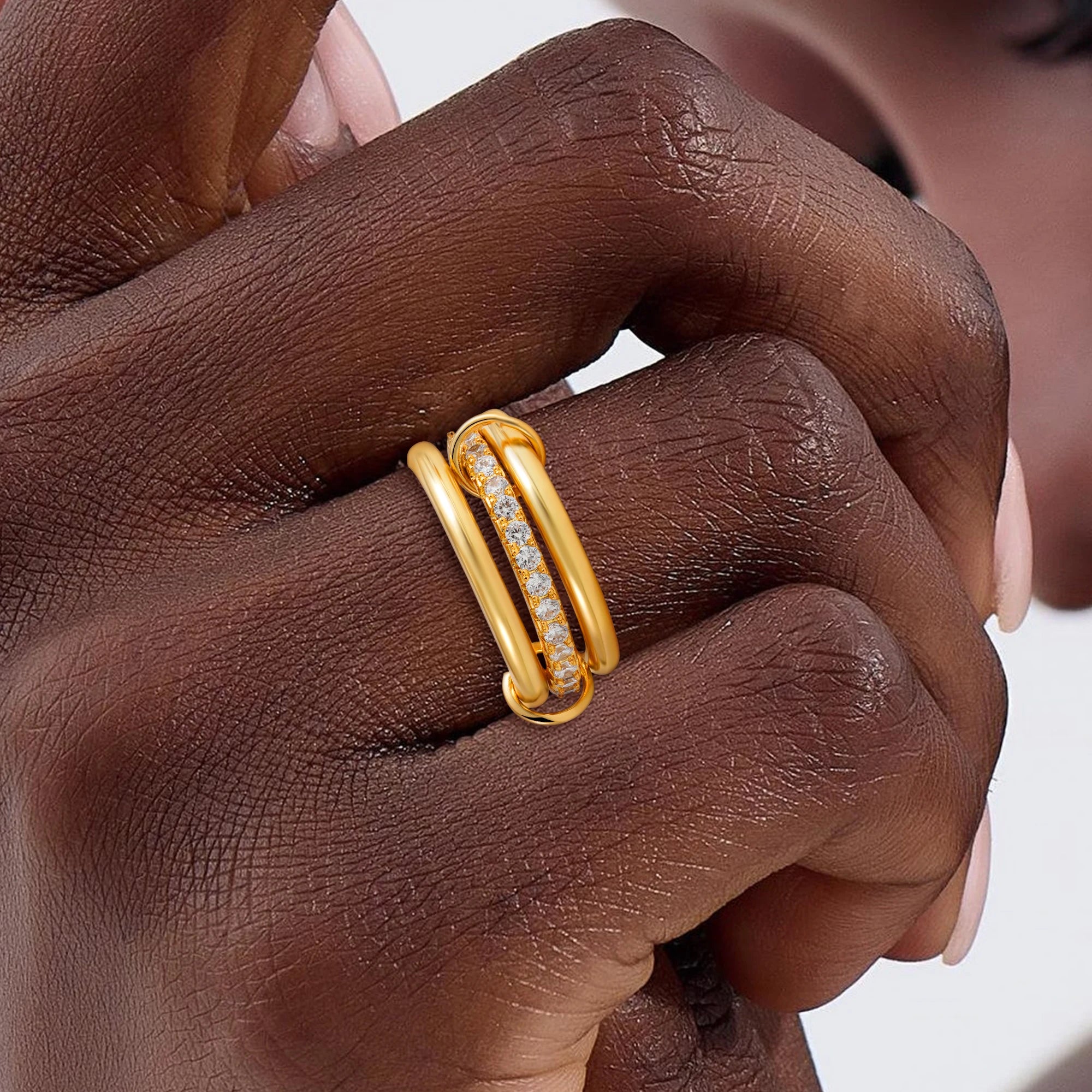 Crafted from durable stainless steel and finished with 18k gold plating, this ring is both stylish and long-lasting. The interlocking design ensures a comfortable fit, while the sparkling stones catch the light beautifully. Whether worn alone or stacked with other rings, it’s a versatile addition to your jewelry collection.